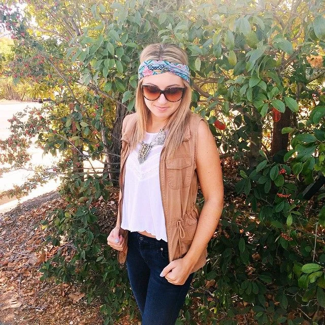 Accessories can make any simple outfit more interesting. I started with my dark washed seven for all mankind jeans and my white flowy @freepeople top. I added a vest, a chunky necklace from anthropologie, and a tribal print headband. Went from simple to accessorized in minutes! Xoxo, Danielle