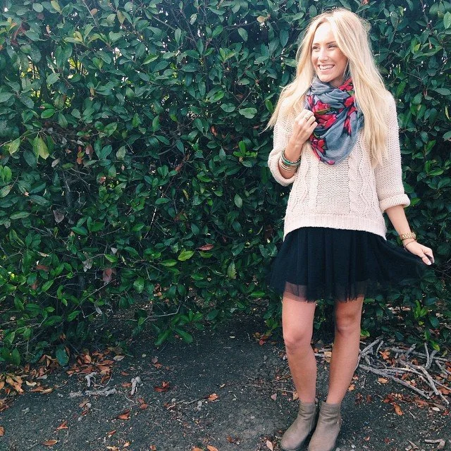 I was in a party mood this morning so I put on a fun black tulle dress! I layered it with a chunky cable knit sweater and rose printed scarf to give it a fall feel! Mixing textures is really fun and adds lots of dimension to your look plus the added layers are keeping me warm today! Xoxo, Alexa