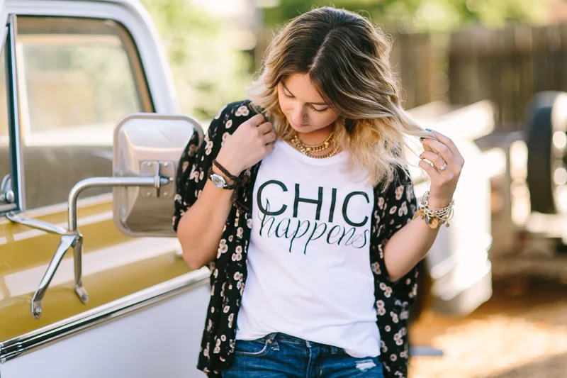 I've been drawn to graphic and basic tshirts lately, as good basics for under patterned kimonos and to go with patterned pants too. This fun chic happens shirt from @rosewoodboutique monthly tshirt club is so comfy and can easily be worn off the shoulder too. I paired my tee with this @brandymelvilleusa kimono (from platos closet) and my @gap jeans (thrifted from Savers). And because I love my @converse, I wore those too :) xoxo, Danielle