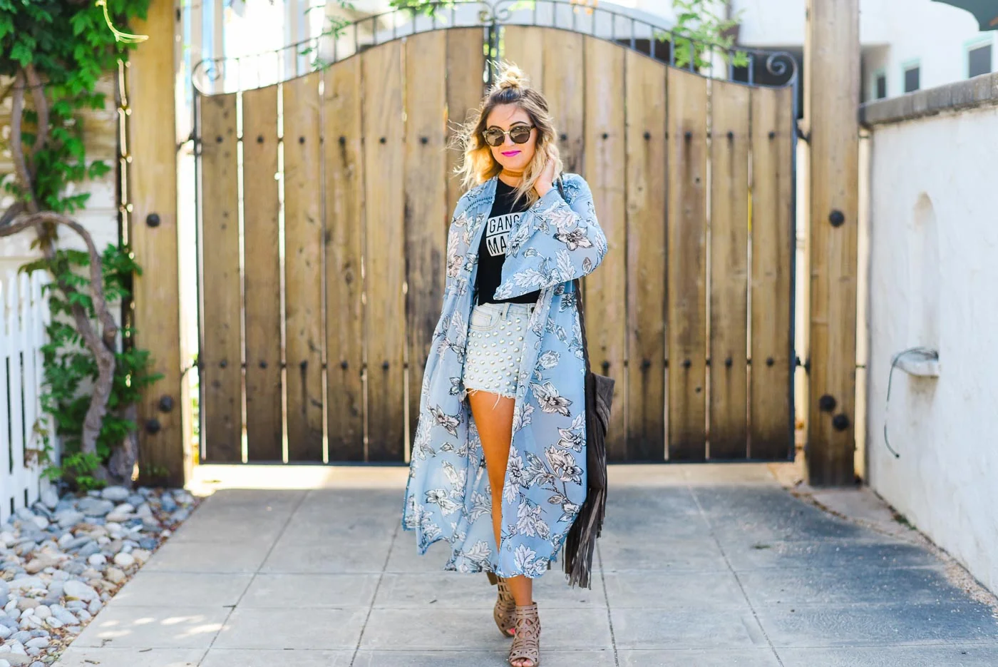 99% of the music on my playlist involves rap music, so this shirt is very fitting! I love wearing graphic tees with kimonos and dusters, so I paired it with the bell sleeve duster from Rural Haze. Since the shirt is a crop top, I had to wear high waisted shorts so I opted for my fav Unif brand ones. For accessories, i'm wearing a choker I got for my birthday, heeled booties from Divine Treasures Boutique, and my JJ Winters fringe purse. I am always obsessed with mixing grunge, funky items with girly prints like this floral duster. The mix of my tattered shorts, graphic tee, and floral duster pretty much sums up my overall style.